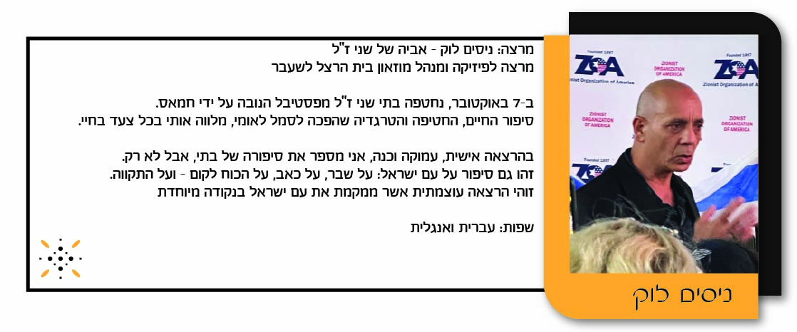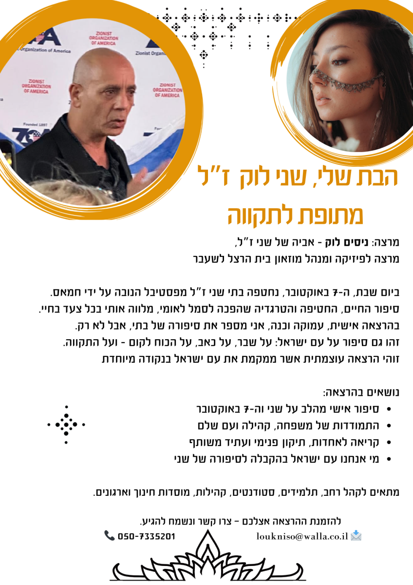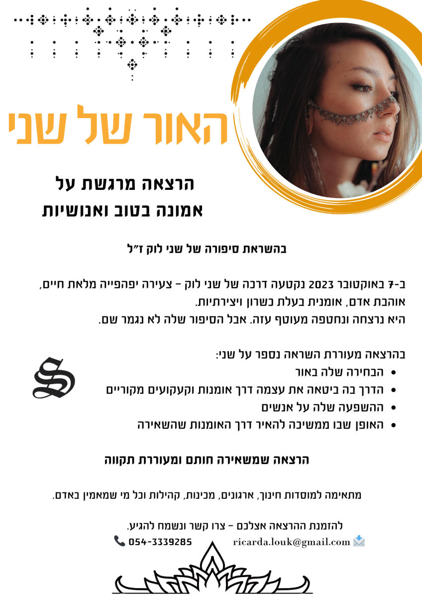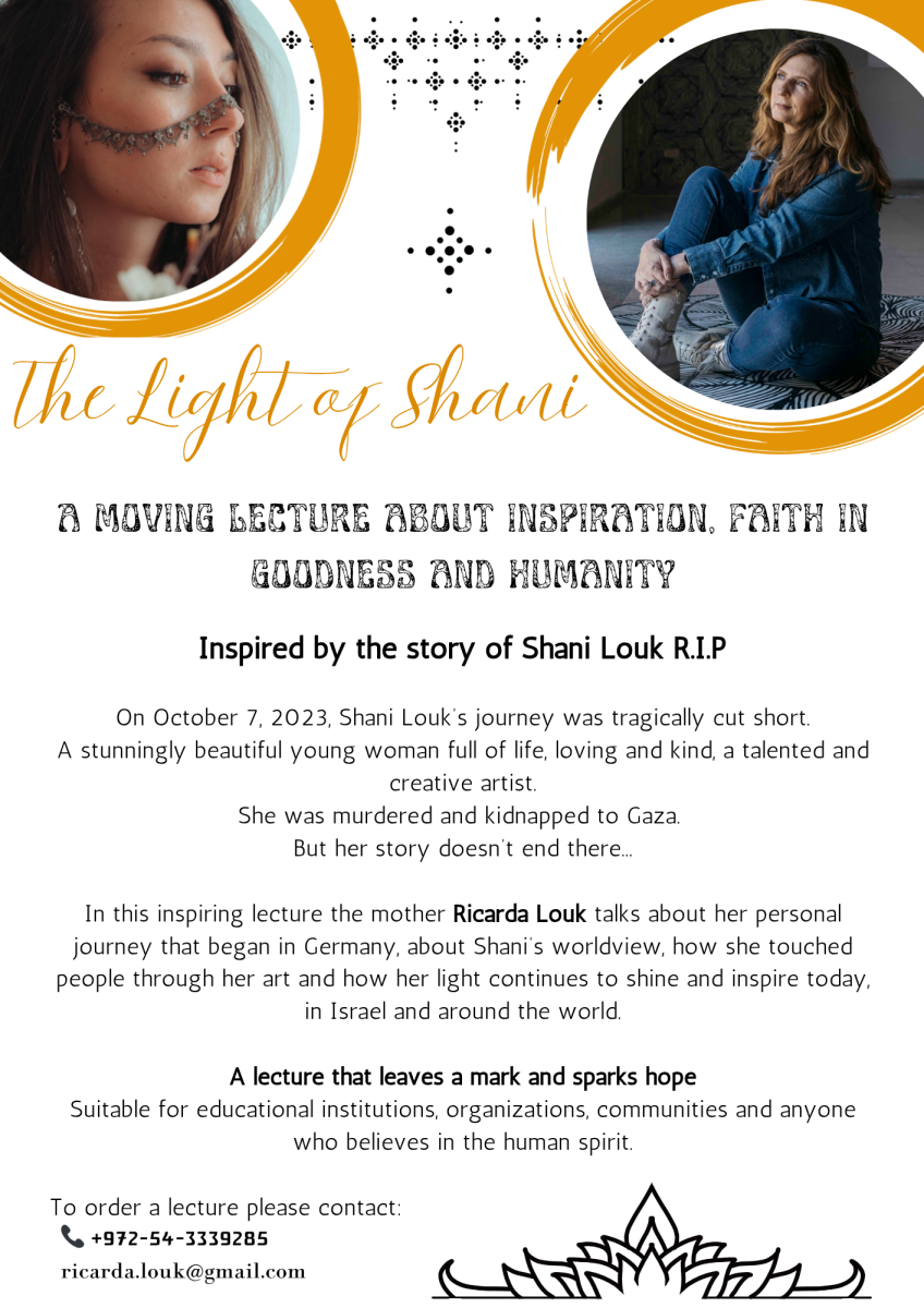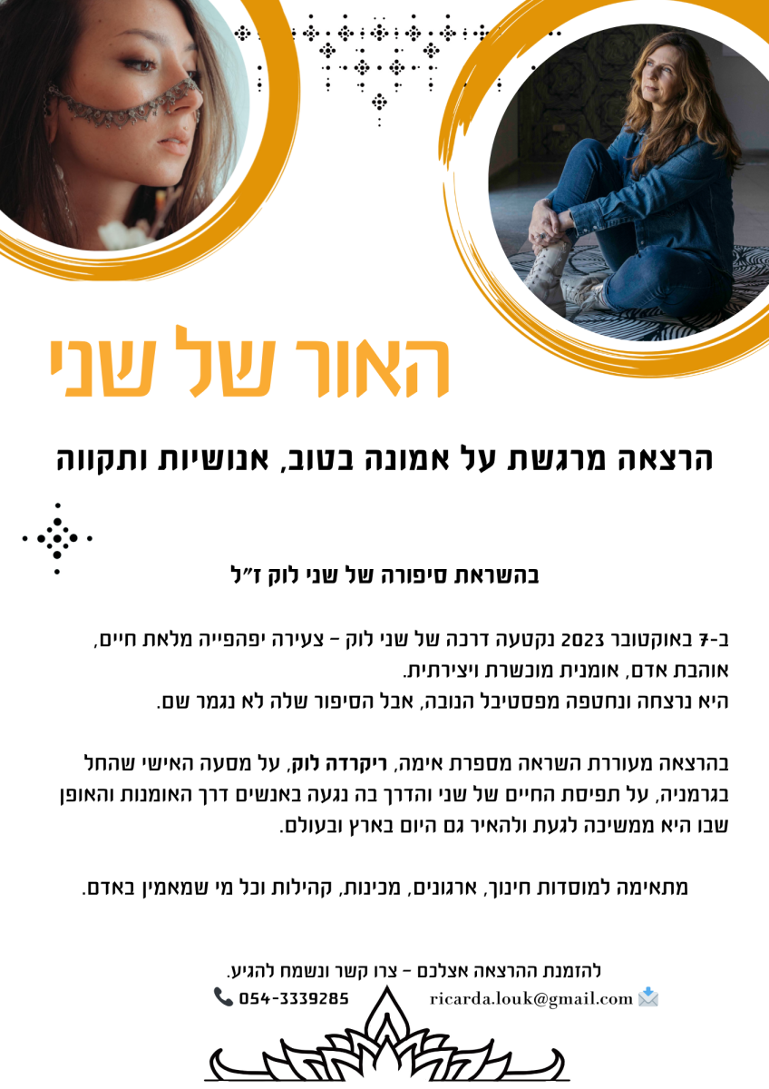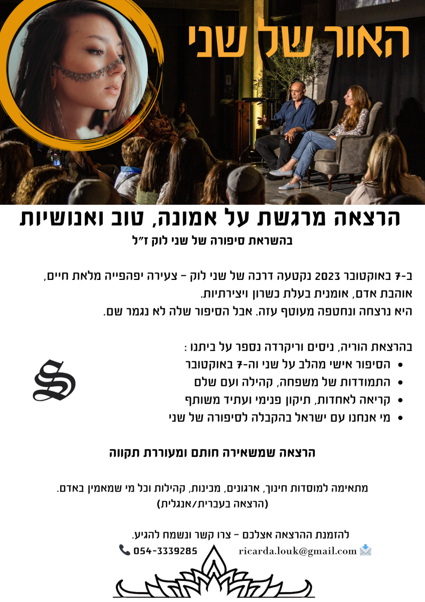 אני ממליצה בחום על ההרצאה שלך לכל קבוצה, ארגון או קהילה שמבקשים לעצור לרגע, להיפתח, להתחבר ולבחור כל יום מחדש להתמקד בחיים בנקודות של אור, חוסן ואופטימיות, גם ברגעים הכי קשים. תודה לך על מי שאת, ועל שפתחת בפנינו דלת ללב שלך וללב של שני